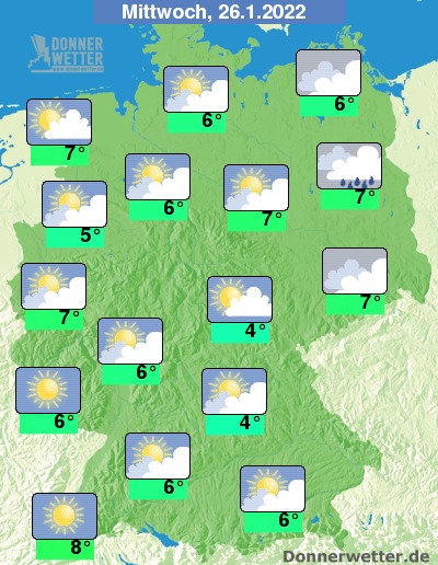 Am Mittwoch zeigt sich das Wetter oft trüb oder bedeckt, hier und da und vor allem im Süden zeigen sich aber auch Aufheiterungen. Bis auf einige Tropfen über Berlin-Brandenburg bleibt es trocken. Die Temperatur steigt auf 4 Grad in Nürnberg und bis 8 Grad in Freiburg.