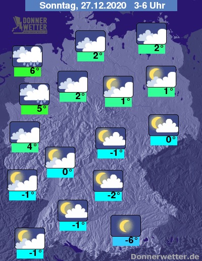 In der folgenden Nacht ist es im Süden anfangs noch oft locker bewölkt oder sternenklar, von Nordwesten her zieht es sich im Nachtverlauf aber zu. Im übrigen Land ist es bereits stark bewölkt und vom Niederrhein bis nach Schleswig-Holstein fällt zeitweise Regen, weiter nach Südosten hin bleibt es hingegen trocken. Die Temperatur sinkt auf 6 Grad in Cuxhaven und bis -6 Grad im Raum München.