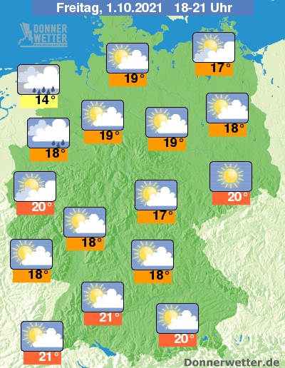 Heute Abend bringen dichte Wolken vom Niederrhein bis ins Emsland gebietsweise Regen. Oft stark bewölkt ist es auch im übrigen Westen und Norden, jedoch noch weitgehend trocken. Im übrigen Bundesgebiet ist es noch oft heiter bis wechselnd, hier und da aber auch stärker bewölkt, dazu bleibt es trocken. Die Temperatur liegt bei etwa 14 Grad in Bremerhaven und 21 Grad in Freiburg.