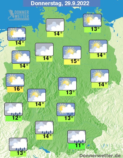 Am Donnerstag ist es über dem Norden und Westen teils heiter, teils ziehen dichte Wolken durch, dazu sind nur selten Schauer möglich. Im übrigen Land bleibt es dagegen meist bedeckt und es bilden sich gebietsweise Schauer. Die Temperatur steigt auf 11 Grad in München und bis 16 Grad in Düsseldorf.