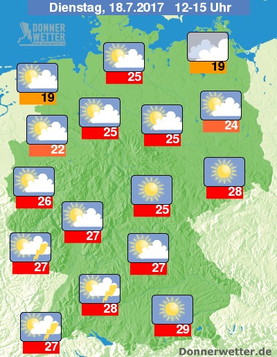 Heute Nachmittag zeigt sich das Wetter zum Großteil heiter oder sonnig, hier und da ziehen auch mal mehr Wolken durch, im Süden sind dabei vereinzelte Schauer oder Gewitter möglich, sonst bleibt es aber trocken. Die Temperatur liegt bei 19 Grad an den Küsten von Nord- und Ostsee und bis 29 Grad in Rosenheim.