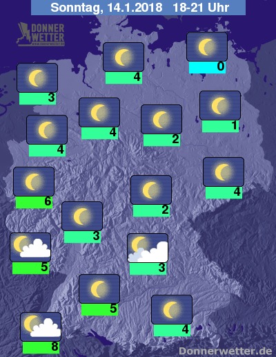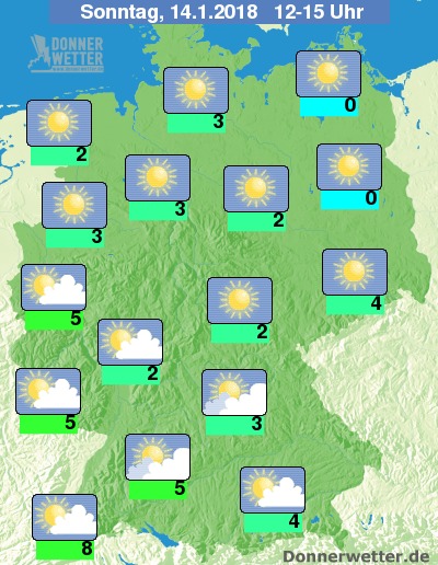 Heute Nachmittag ist es im Süden und Westen heiter bis aufgelockert bewölkt, sonst ist es im Land sogar verbreitet sonnig, dabei bleibt es bundesweit trocken. Die Temperatur liegt bei 0 Grad im nördlichen Brandenburg und bis 8 Grad im Breisgau.