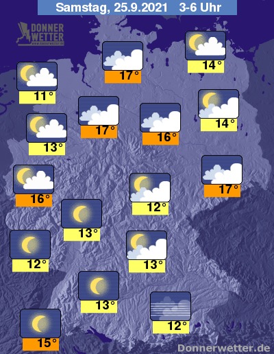 In der Nacht zum Samstag bleibt der Himmel über der Nordhälfte des Landes größtenteils stark bewölkt, Auflockerungen sind jedoch möglich. Über der Südhälfte funkeln dagegen verbreitet die Sterne und es ziehen nur selten Wolken durch. Es bleibt bundesweit trocken bei Tiefstwerten von 17 Grad in Dresden und etwa 11 Grad an der Ems.