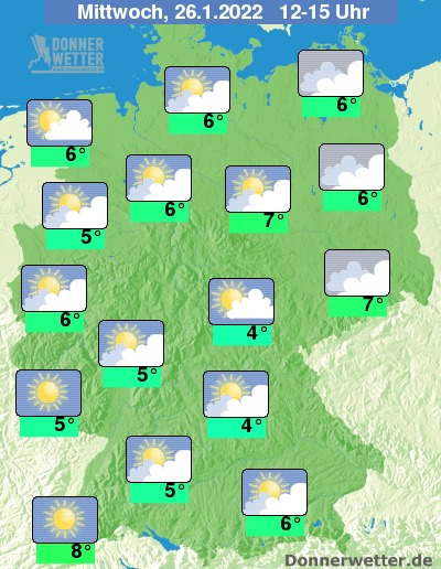 Heute Nachmittag zeigt sich das Wetter oft trüb oder bedeckt, hier und da und vor allem im Süden zeigen sich aber auch Aufheiterungen. Bis auf seltene Tropfen über Berlin-Brandenburg bleibt es trocken. Die Temperatur liegt bei 4 Grad in Nürnberg und etwa 8 Grad in Freiburg.