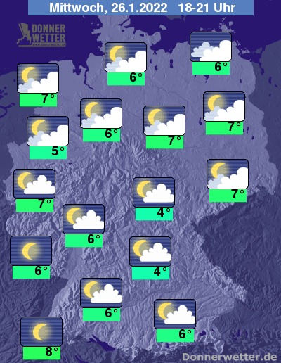 Heute Abend ist der Himmel über dem Südwesten oft sternenklar. Im Nordosten ist es hingegen meist bedeckt. Über dem übrigen Bundesgebiet ist es locker bis aufgelockert, teils auch stark bewölkt. Es bleibt bundesweit trocken bei 4 Grad in Erfurt und bis 8 Grad in Freiburg.