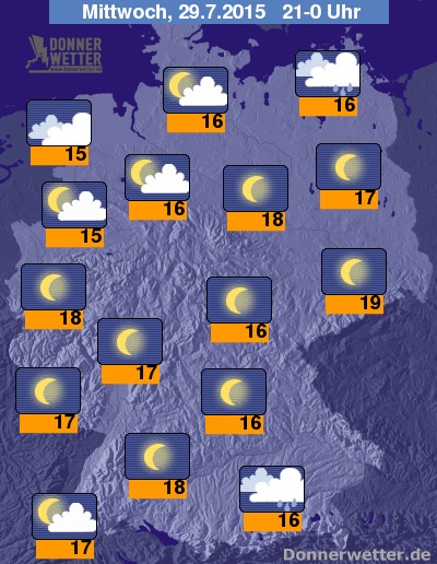 In der Nacht zum Donnerstag ziehen im äußeren Norden noch meist dichte Wolken durch, die für etwas Regen oder einzelne Schauer sorgen können. Am Alpenrand ist es oft stark bewölkt, aber weitgehend trocken. Im übrigen Bundesgebiet ist es hingegen überwiegend sternenklar, vor allem im Süden auch locker bewölkt und dabei trocken. Die Temperatur sinkt auf 14 Grad in Ostfriesland und bis 7 Grad am Pfälzer Wald.