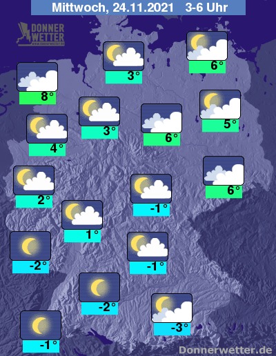 In der folgenden Nacht bleibt es vor allem im Norden größtenteils stark bewölkt. Im übrigen Land ist es schon oft locker bewölkt oder sternenklar und sonst lockert die anfangs noch oft starke Bewölkung mehr und mehr auf. Es bleibt überall trocken bei Tiefstwerten von 8 Grad an der Nordsee und -3 Grad im Berchtesgadener Land.