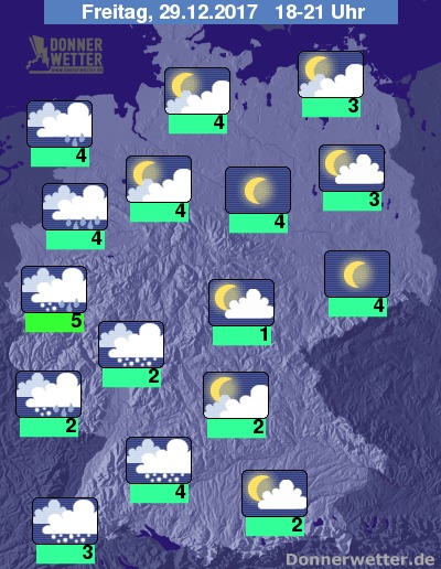 Heute Abend ziehen von Westen her dichte Wolken und mit anfangs häufig Schnee, später weitgehend Regen in die westlichen Landesteile, dabei kann es vielerorts glatt auf den Straßen werden! Über der Osthälfte bleibt es hingegen meist noch locker bewölkt, häufig sogar sternenklar und dazu trocken. Die Temperatur liegt bei 1 Grad im Eichsfeld und um 5 Grad im Rheinland.