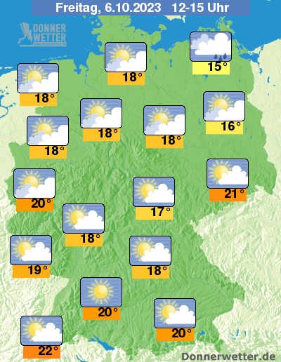 Heute Nachmittag ziehen über den Norden oft dichte Wolken, dabei sind hier einige Tropfen möglich. Von der breiten Landesmitte bis in den Süden ist es dagegen häufig heiter und teils sonnig. Gebietsweise ziehen auch einige Wolken durch, dabei bleibt es aber trocken. Die Temperatur liegt bei 15 Grad an der Müritz und 22 Grad am Oberrhein.