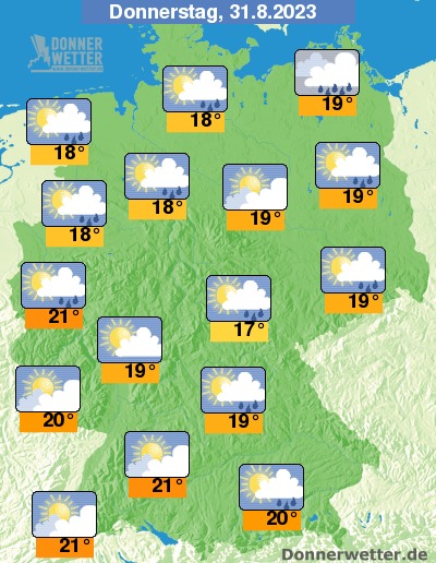 Am Donnerstag ist es vor allem im Norden zumeist stark bewölkt mit zeitweiligen Schauern, örtlich sogar Gewittern. Weiter nach Süden hin zeigt sich die Sonne häufiger, hier sind nur vereinzelte Schauer zu erwarten. Die Temperatur erreicht 17 Grad in Jena und bis 21 Grad in Freiburg.