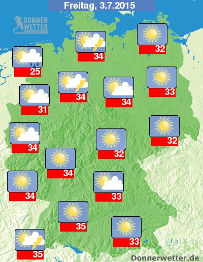Heute wird es in Deutschland wiederum verbreitet sonnig, hier und da können ein paar lockere Wolken durchziehen. Ein mäßiges Schauer- und Gewitterrisiko besteht jedoch im Norden Deutschlands, hier sind regional auch schwere Gewitter möglich, auch rund um den Schwarzwald und am Alpenrand können vereinzelte Schauer und Gewitter auftreten, sonst bleibt es aber trocken. Die Temperatur steigt auf verhältnismäßig frische 25 Grad an der Nordsee und auf tropische 35 Grad im Breisgau.
