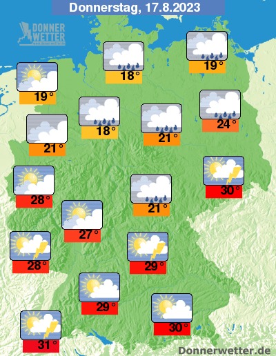 Heute halten sich vor allem im Norden und Nordosten oft dichte Wolken und es bilden sich gebietsweise Schauer. Im übrigen Land ist es teils heiter, teils stark bewölkt und es besteht ein leichtes bis mäßiges Schauer- und Gewitterrisiko. Die Temperatur erreicht teils nur 18 Grad in der Norddeutschen Tiefebene und bis 31 Grad im Breisgau.