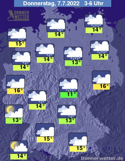 In der Nacht zum Donnerstag breiten sich die kompakten Wolken und der teils kräftige Regen immer weiter nach Südosten hin aus. Gegen Morgen sind dann auch im Südosten Deutschlands Regenfälle möglich. Auflockerungen zeigen sich insgesamt nur selten bei Tiefstwerten von 16 Grad in Köln und 11 Grad in Jena.