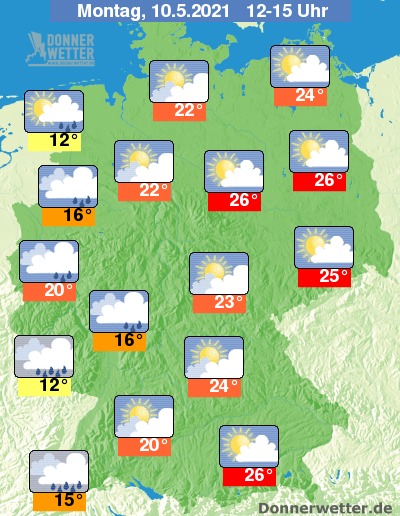 Heute Nachmittag ist es über der Westhälfte des Landes schon meist bedeckt und es fällt gebietsweise Regen, weiter nach Osten hin scheint dagegen auch noch oft die Sonne, wobei auch hier die Wolken immer weiter zunehmen, hier bleibt es noch trocken. Die Temperatur liegt bei 12 Grad an der Nordsee und bis 26 Grad im Berliner Umland.