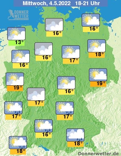 Heute Abend ist es auch nördlich des Mains häufiger stark, gebietsweise jedoch auch wechselnd bewölkt, dazu bleibt es trocken. Weiter nach Süden hin ziehen größtenteils dichte Wolken durch, dazwischen zeigen sich Aufheiterungen, jedoch bilden sich vielerorts Schauer und nicht selten auch Gewitter. Die Temperatur liegt bei 13 Grad in Cuxhaven und 19 Grad in Dresden.