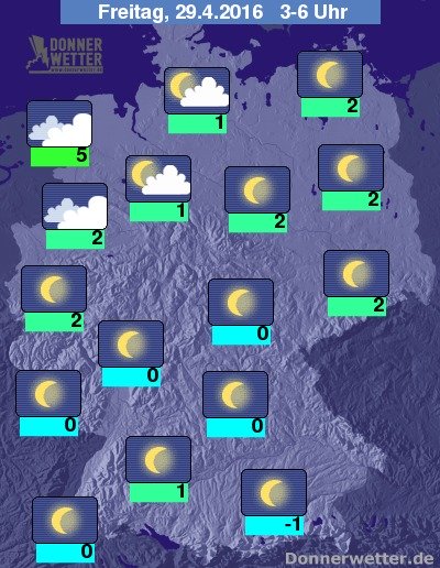 In der kommenden Nacht ziehen vor allem im Nordseeumfeld oft dichte Wolken durch, aber auch im übrigen Nordwesten des Landes zeigen sich oft viele und zum Teil dichte Wolken, jedoch bleibt es trocken. Im großen Rest der Republik zeigt sich dagegen ein größtenteils sternenklarer Nachthimmel. Lockere Wolken können jedoch besonders im Norden und Westen durchziehen, dabei bleibt es trocken. Die Temperatur sinkt auf 5 Grad im Harlinger Land und bis -1 Grad im Raum München.
