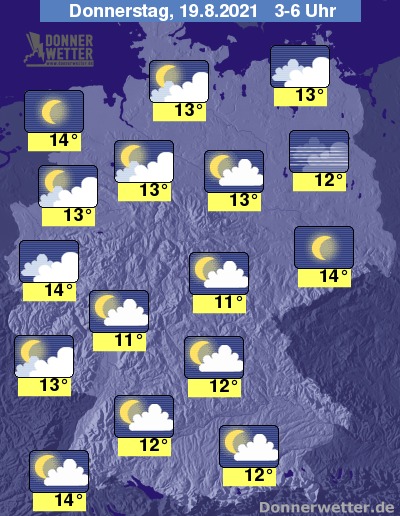 In der folgenden Nacht ist der Himmel überwiegend locker bewölkt oder sogar sternenklar. Gegen Morgen können hier und da mehr Wolken durchziehen, dazu bleibt es aber trocken. Die Temperatur sinkt auf 14 Grad im Rheinland und etwa 11 Grad im Vogtland.