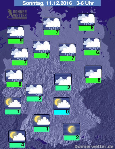 In der Nacht zum Sonntag fällt zunächst über der Nordhälfte Deutschlands verbreitet Regen bei weitgehend dichter Bewölkung. Die dichten Wolken und der Regen breiten sich zum Morgen dann auch weiter ins nördliche Badenwürttemberg und Bayern aus. Im Alpenvorland bleibt es hingegen meist locker oder wechseld bewölkt und trocken. Die Temperatur sinkt auf 9 Grad  an der Nordsee und bis auf 0 Grad in Mittelfranken.