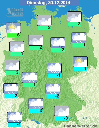 Heute bleibt es den Tag über meist wolkenverhangen und besonders in der Südhälfte des Landes fällt verbreitet Schnee. Im Norden und Westen kann es vereinzelt auch mal etwas auflockern, dazu fällt hier nur gelegentlich etwas Schnee, Schneeregen oder Regen. Die Temperatur steigt auf -3 Grad in München und bis 6 Grad an der Nordsee.