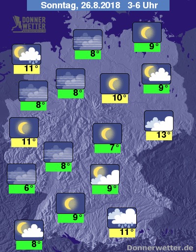 In der Nacht zum Sonntag zieht sich der Regen im Süden immer weiter auf den Südosten zurück und im übrigen Süden klart es dafür weiter auf. Über Sachsen und dem östlichen Brandenburg bleibt es stark bewölkt, aber trocken. An der Nordsee sind einzelne Schauer möglich. Im großen Rest des Landes ist der Himmel hingegen verbreitet sternenklar, dazu bleibt es trocken. Die Temperatur sinkt auf 13 Grad in Dresden und bis 6 Grad im Saargau.
