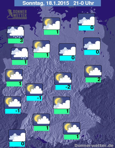 Heute Abend ist es überwiegend aufgelockert, vor allem nach Osten und Süden hin auch zeitweise nur gering bewölkt, sowohl im Nordosten als auch im Nordwesten halten sich meist dichte Wolken und es fällt zeitweise Regen, Schneeregen oder Schnee, in den anderen Landesteilen bleibt es trocken. Die Abendtemperatur liegt bei 3 Grad in Emden und um -2 Grad am Odenwald.