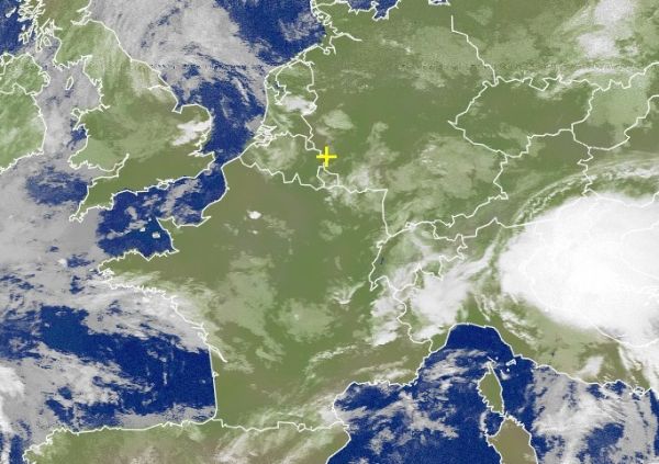 Dichte Wolken liegen nach dem Satellitenbild von heute Mittag über Deutschland. Es fallen lokal Schauer.