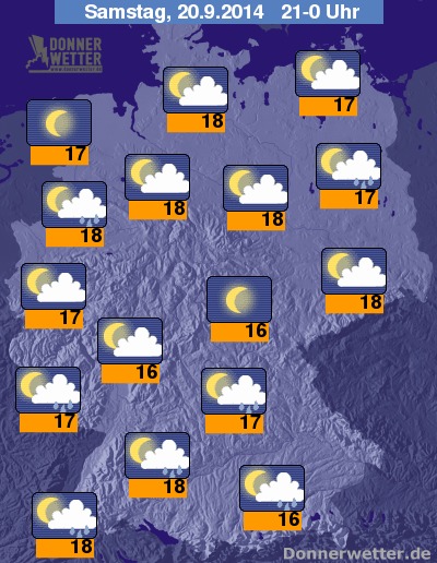 Heute Abend lassen Schauer und Gewitter insgesamt nach, vor allem in der Südhälfte sind aber noch einige Gewitter unterwegs, weiter nach Norden lockert die Bewölkung nach und nach etwas auf und es treten nur noch vereinzelt Schauer und Gewitter auf, zumeist bleibt es trocken. Die Abendtemperatur liegt bei sehr einheitlichen 18 bis 16 Grad.