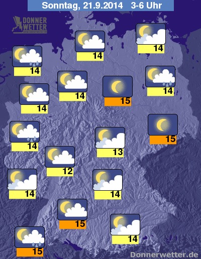 In der Nacht zum Sonntag sind vor allem im Süden weitere Schauer und Gewitter möglich, sonst ist die Bewölkung aber zumeist aufgelockert bewölkt und es treten nur noch vereinzelt Schauer und Gewitter auf. Gebietsweise wird es im Norden und Osten auch klar. Die Temperatur sinkt auf 15 Grad im Oberrheingraben und bis 12 Grad im Odenwald.
