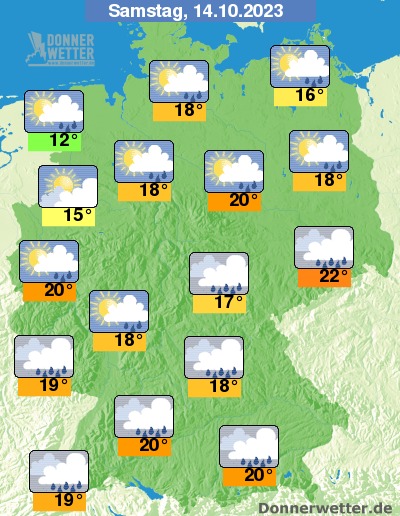 Am Samstag bleibt es im Süden meist stark bewölkt, dabei bilden sich zeitweise Schauer. Ansonsten ist es aber auch oft heiter, teils ziehen dichte Wolken durch, dabei bilden sich einzelne Schauer. Die Temperatur steigt auf 12 Grad in Wilhelmshaven und bis 22 Grad in Dresden. Im Norden weht oft starker Wind. An der See herrscht zum Teil schwerer Sturm.