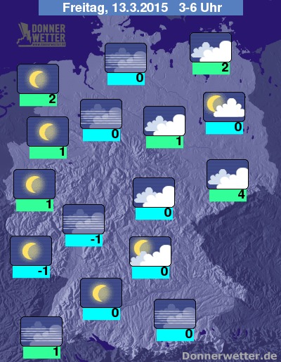 In der kommenden Nacht bleibt es in der Westhälfte, im Südosten und zunächst auch im Nordosten Deutschlands überwiegend sternenklar und trocken, nur stellenweise bildet sich Nebel. Im Osten und in der östlichen Mitte des Landes, sowie ab der zweiten Nachthälfte auch im Nordosten ziehen jedoch oft dichte Wolken durch und hier und da ist auch etwas Regen, Schneeregen oder Schnee möglich, zumeist bleibt es aber trocken. Die Tiefstwerte liegen bei 4 Grad in Dresden und um -1 Grad im Saargau.