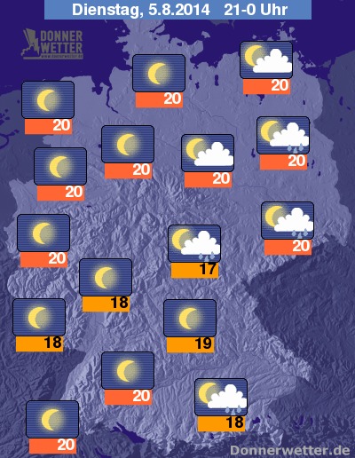 In der Nacht klingen auch die Schauer im Südosten ab, jedoch sind im äußeren Osten weiterhin einzelne Schauer möglich, sonst ist der Himmel aber verbreitet aufgelockert bewölkt oder auch klar und es bleibt trocken. Regional bildet sich Nebel oder Hochnebel. Die Temperatur sinkt auf 15 Grad an der Müritz und etwa 8 Grad am Pfälzer Wald.