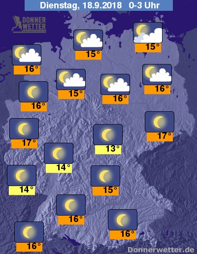 Am späten Abend und in der Nacht bleibt der Himmel über der Nord- und anfangs auch über der Osthälfte locker bewölkt. Im Osten klart es im Nachtverlauf teilweise auf. Im restlichen Bundesgebiet bleibt der Himmel zumeist wolkenfrei.