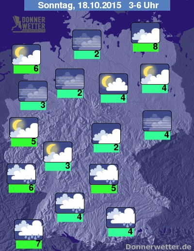In der Nacht zum Sonntag bleibt es südlich einer Linie vom Rheinland bis rüber zum Erzgebirge bei meist dichter Bewölkung und es fällt vor allem im Süden immer wieder Regen. Im Nordosten bleibt es ebenfalls bedeckt, aber trocken. In den übrigen Landesteilen zeigt sich der Himmel oft sternenklar oder aufgelockert bewölkt, dazu bleibt es trocken, es kann sich jedoch stellenweise Nebel oder Hochnebel bilden. Die Temperatur sinkt auf 8 Grad am Stettiner Haff und bis etwa 2 Grad am Westerwald.
