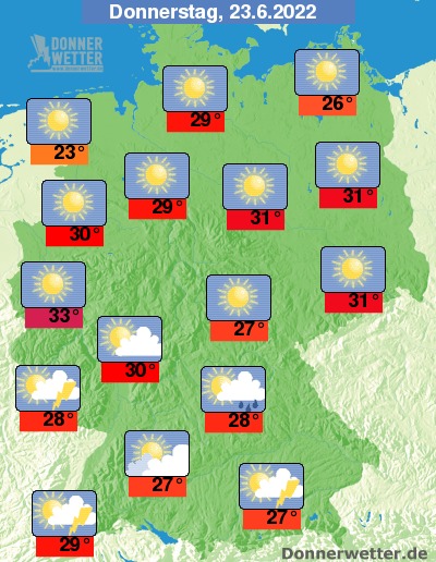 Am Donnerstag ist es im Süden teils heiter, teils bilden sich einige Quellwolken, dabei sind sowohl Schauer als auch örtliche Gewitter möglich. Im übrigen Land ist es verbreitet sonnig und trocken. Die Temperatur steigt auf 23 Grad in Bremerhaven und bis 33 Grad in Köln.