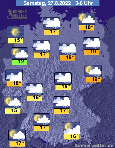 Am Samstag ist es überwiegend wechselnd bis stark bewölkt, im Osten und Süden bilden sich vielerorts Schauer und mögliche Gewitter, während es im übrigen Bundesgebiet größtenteils trocken bleibt. Nach Westen hin heitert der Himmel im Verlauf immer weiter auf. Die Temperatur steigt auf 20 Grad in Jena und bis 27 Grad in Bonn.