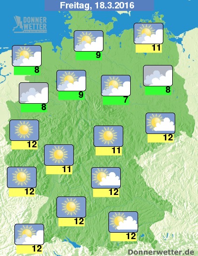 Am Freitag bleibt es über der Südhälfte Deutschlands verbreitet sonnig und es ziehen nur selten einige Wolken durch, dazu bleibt es auch trocken, weiter nach Norden hin ist es dagegen oft stark, gebietsweise auch aufgelockert bewölkt, dabei bleibt es jedoch weitgehend trocken. Die Temperatur steigt auf 7 Grad in Dessau und bis 12 Grad im Oberrheingraben.