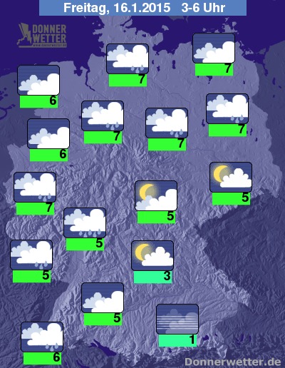In der Nacht zum Freitag ziehen in einem breiten Streifen vom Südwesten und Westen bis in den Nordosten Deutschlands dichte Regenwolken, dabei fällt immer wieder, teils kräftiger Regen. Im Nordwesten bleiben die Wolken ebenfalls meist dicht, jedoch fällt hier nur selten Regen. Im Süden und Osten ist es neben starker Bewölkung auch zeitweise aufgelockert bewölkt, hier bleibt es weitgehend trocken. Die Temperatur sinkt auf 7 Grad in Stralsund und auf etwa 1 Grad in Augsburg. Der Wind weht besonders in der Nordhälfte noch häufig stark mit möglichen Sturmböen, auf den Bergen und an der See ist es teils stürmisch mit möglichen schweren Sturmböen.