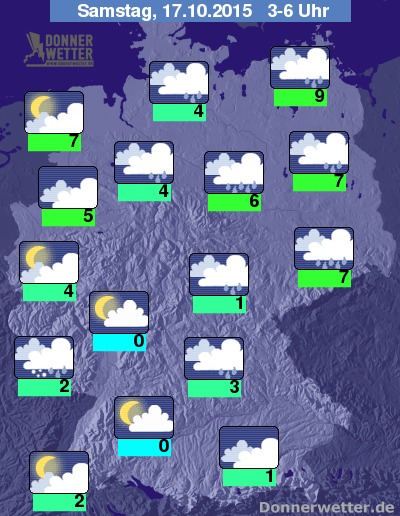 In der Nacht zum Samstag ziehen über die Osthälfte und über den Norden Deutschlands meist dichte Wolken hinweg und es fällt zeitweise Regen. Im äußeren Südwesten und Westen ziehen ebenfalls oft dichte Wolken mit Regen durch. Im übrigen Bundesgebiet ist es teils locker, teils stärker bewölkt, aber dabei meist trocken. Die Temperatur sinkt auf 9 Grad in Neubrandenburg und bis Werte um 0 Grad an der Schwäbischen Alb. Stellenweise ist zum Morgen Glätte durch überfrierende Nässe oder Rauhreif möglich.