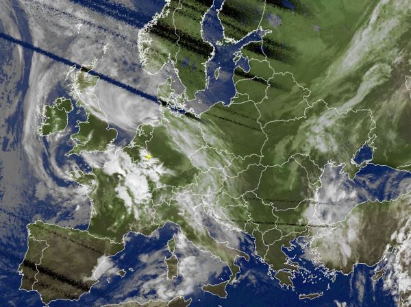 Das Satellitenfoto von heute Morgen zeigt besonders über Frankreich verbreitet kräftige Quellwolken bzw. Gewitterwolken, sie gehören zu einem Tief mit Kerndruck über der Bretagne und sorgen für zum Teil schwere Unwetter mit starkem und ergiebigem Regen, Hagel und einzelnen Sturmböen.
