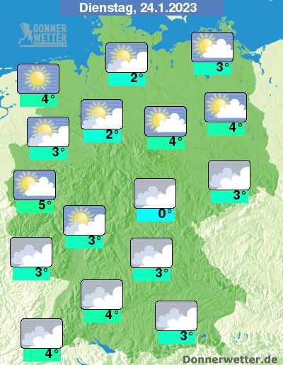 Am Dienstag ist es über der Südhälfte des Landes dicht bewölkt oder trüb. Im übrigen Bundesgebiet ist es teilweise heiter, teils hält sich auch dichte Bewölkung, dabei bleibt es trocken. Die Temperatur erreicht 0 Grad im Vogtland und bis 5 Grad im Rheinland.