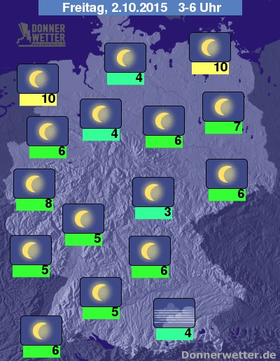 In der kommenden Nacht ist der Himmel über Deutschland weitgehend sternenklar und es bleibt trocken. Die Temperatur sinkt auf Werte um 10 Grad an den Küsten von Nord- und Ostsee und auf etwa 4 Grad im Raum München. Im Süden Deutschlands bildet sich gebietsweise Nebel oder Hochnebel, dazu besteht auch stellenweise die Gefahr durch Reifglätte.