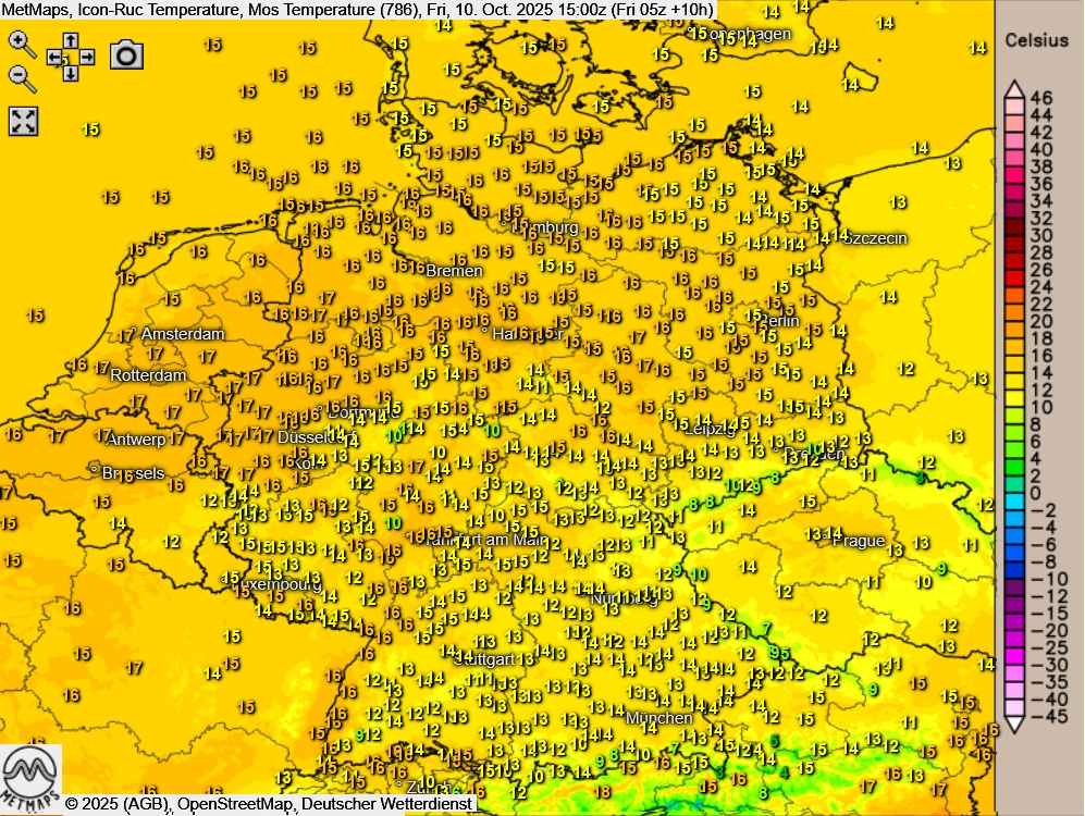 Die Lufttemperaturen sowie die Wetterkarte für Freitagnachmittag (15:00 Uhr) nach Icon-Ruc: