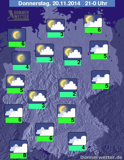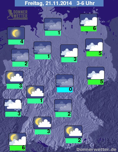 In der Nacht zum Freitag ist es im Süden und Osten aufgelockert oder stark bewölkt und trocken, vor allem von der Mitte bis in den Nordwesten des Landes ist es häufig sternenklar, sonst ist es meist nur locker bewölkt. Es bleibt fast überall trocken, nur im Südwesten ist gegen Morgen etwas Regen möglich. Gebietsweise bildet sich wieder Nebel oder Hochnebel. Die Temperatur sinkt auf 6 Grad in Rostock und auf 0 Grad im Vogtland.