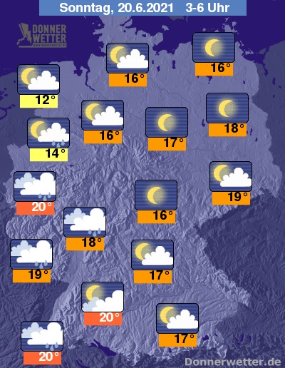 In der Nacht zum Sonntag bleibt es über der Nordosthälfte der Bundesrepublik verbreitet sternenklar oder locker bewölkt und dazu trocken. Oft dichte Wolken ziehen über den Westen und Südwesten des Landes hinweg, dabei bilden sich hier gebietsweise Schauer und selten sind auch Gewitter möglich. Im übrigen Land ist es bei meist lockerer bis aufgelockerter Bewölkung trocken. Die Temperatur sinkt auf 20 Grad in Stuttgart und bis 12 Grad in Bremerhaven.