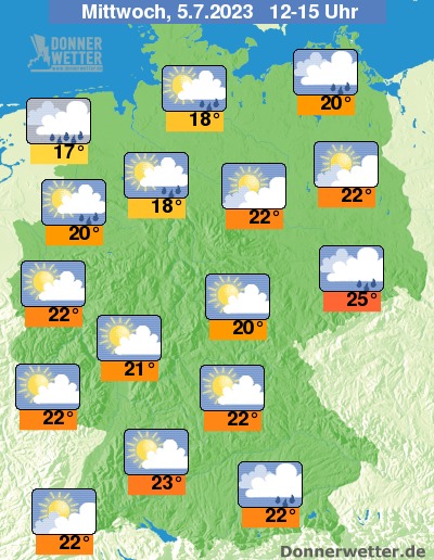 Heute Nachmittag zeigen sich zum Teil heitere Abschnitte, teils ziehen jedoch kompakte Wolken durch, dabei bilden sich vor allem im Nordwesten und Norden, sowie auch am Alpenrand einzelne Schauer, an den Alpen auch Gewitter. Im übrigen Land bleibt es meist trocken. Die Temperatur liegt bei 17 Grad an der Nordsee und bis 25 Grad an der Neiße.