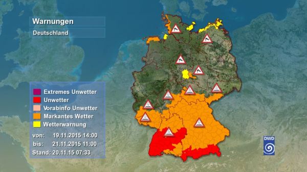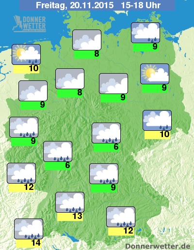 Heute Nachmittag präsentiert sich vor allem die Südhälfte Deutschlands verbreitet sehr nass mit oft starkem und teils ergiebigem Regen, aber auch im Norden ist es meist stark, gebietsweise aber auch aufgelockert bewölkt, dazu fällt jedoch nur regional Regen und oft bleibt es auch trocken. Die Temperatur liegt bei 6 Grad in Oberfranken und bis 14 Grad im Oberrheingraben. Im Süden weht oft starker, teils auch stürmischer Wind, dabei sind Sturmböen möglich.