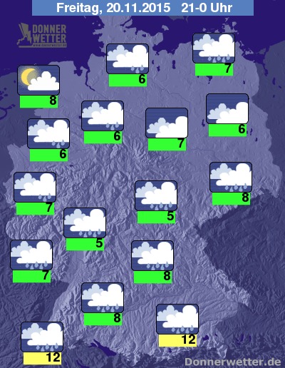Heute Abend fällt besonders über dem Süden der Republik weiterhin teils starker und auch ergiebiger Regen, aber auch über der breiten Mitte ist es überwiegend regnerisch bei ebenfalls dichter Bewölkung. Im Norden fällt im Küstenumfeld häufig Regen, sonst ist es hier aber bei meist starker Bewölkung zum Großteil trocken. Die Abendtemperatur liegt bei 12 Grad in Augsburg und um 5 Grad am Taunus. Im Süden weht ein teils starker bis stürmischer Wind, dabei sind einzelne Sturmböen möglich.