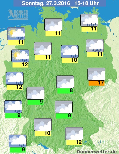 Am Ostermontag nach Osten hin zunächst aufgelockert, teils stark bewölkt und trocken, sonst aus Westen meist dichte Wolken und häufiger, teils kräftiger Regen, teils Schauer und Gewitter, 10 bis 15 Grad, teils sehr windig.