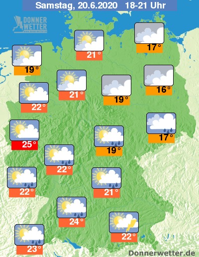 Heute Abend bleibt es über dem Norden und Osten weiterhin meist stark bewölkt und es lockert nur hier und da etwas auf. Regen fällt noch etwa von der Lausitz bis nach Thüringen, sonst bleibt es weitgehend trocken. Vom Emsland bis nach Westdeutschland ist es überwiegend heiter und weitgehend trocken, über der übrigen Südwesthälfte ziehen jedoch neben heiteren Abschnitten oft dichte Wolken durch und es bilden sich gebietsweise Schauer und örtlich auch Gewitter. Die Temperatur liegt bei teils 16 Grad an der Oder und bis 25 Grad in der Kölner Bucht.
