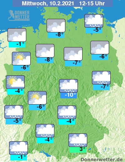 Heute halten sich über der Südosthälfte Deutschland weitgehend dichte Wolken und es fällt verbreitet, zum Teil auch langanhaltend Schnee, im äußeren Süden zum Teil auch Regen. Im übrigen Bundesgebiet ist es oft stark, teils aber auch aufgelockert bewölkt, dabei kann hier und da etwas Schnee fallen, zumeist bleibt es jedoch trocken. Die Temperatur liegt bei sehr frostigen -10 Grad im Thüringer Becken und rund 3 Grad im Berchtesgadener Land.